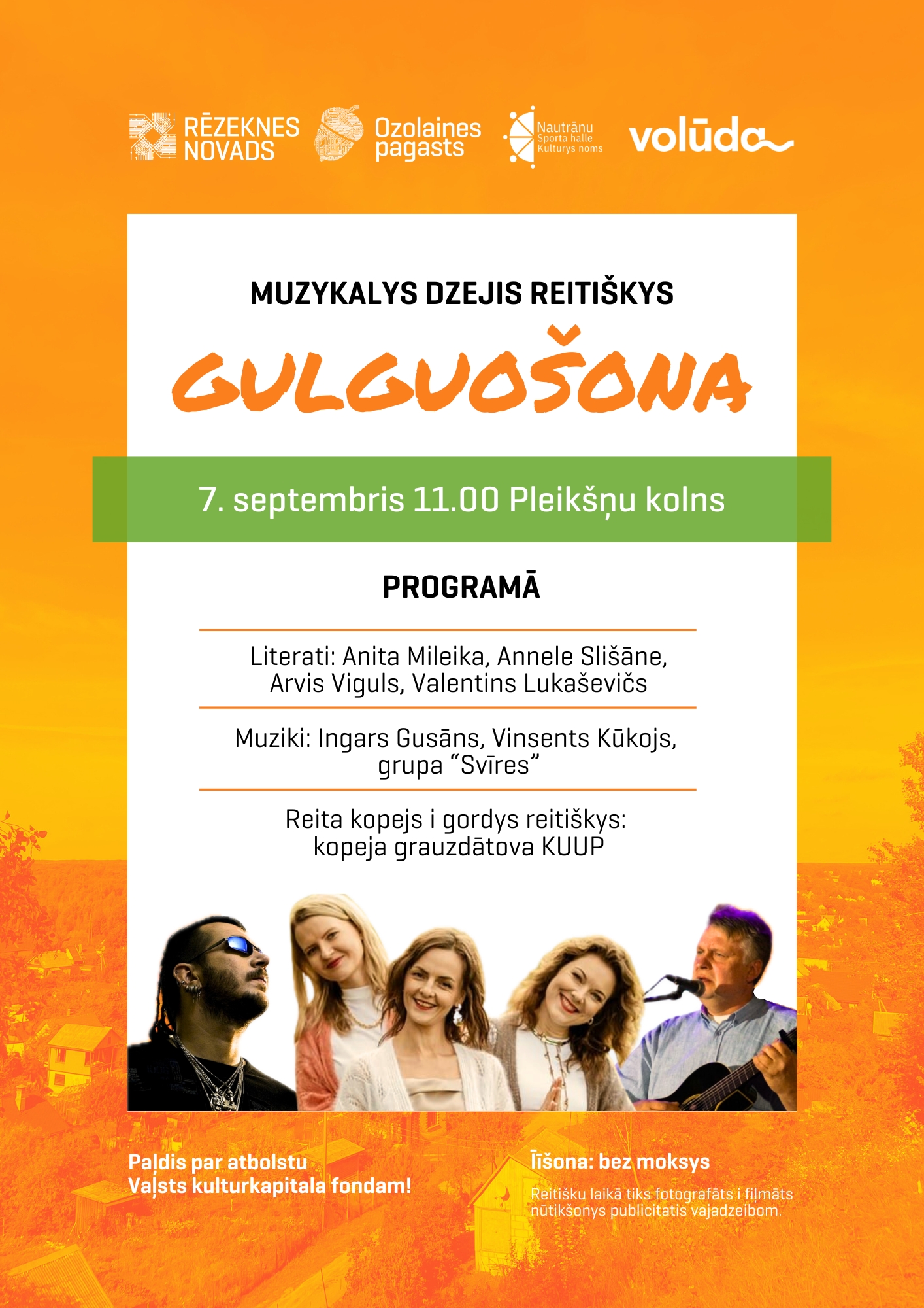 Dzejas dienās Pleikšņu kalnā notiks muzikālas dzejas brokastis “Gulguošona”. Brokastosim kopā ar literātiem Anneli Slišāni, Arvi Vigulu, Valentinu Lukaševicu un Anitu Mileiku. Muzikālo noskaņu sarūpēs Ingars un Mareks Gusāni, Vinsents Kūkojs un flautistu grupa “Svīres”, kas tautas dziesmu apdarē izmanto arī mandolīnu, kokli un sitamos instrumentus. Brokastu gardumus un kafiju piedāvās “KUUP”.